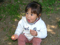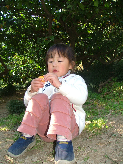 いざみかん狩りを始めると、湖白は斜面がうまく登れず、転びそうな足下が怖かったのか、座って食べるのが精一杯。真白はまるで猿のように、どんどん上へ上へと美味しいみかんを求め、消えていってしまいましたが……。