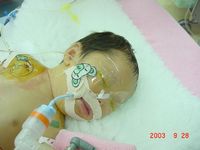 明日(9月30日)に予定されてた最難関のノーウッド型手術は、現時点の湖白の状態では手術に耐えられないという判断から断念。ショックの状態から改善できず、むくみばかりが目立ってくるようになった。病院へ搬送された時の体重は2,600g、現時点ではここ3日間で毎日350ccずつ合計1,050ccぐらい水分が身体にたまってむくみとなっていた。体重の約1/3が余計な水分で満たされてしまっている危険な状態だった。この状態を回避するための両側肺動脈拘束(バンディング)手術を緊急手術で今日の午後行うことになった。